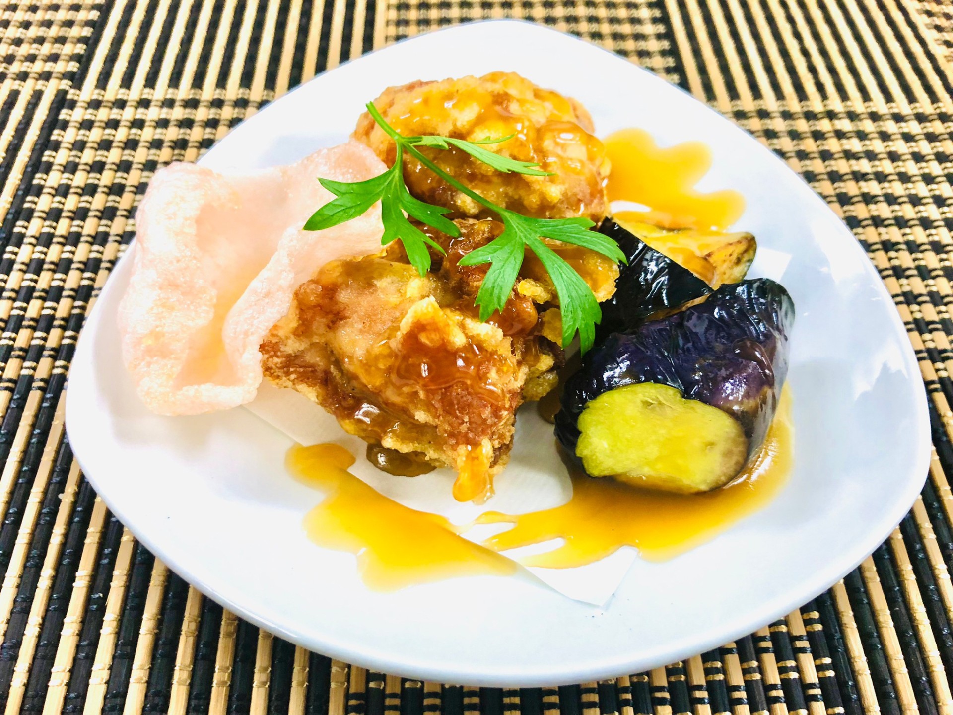 中華風炊き込みご飯と鶏の唐揚げ甘酢あんかけサラダ付きのセットです。
