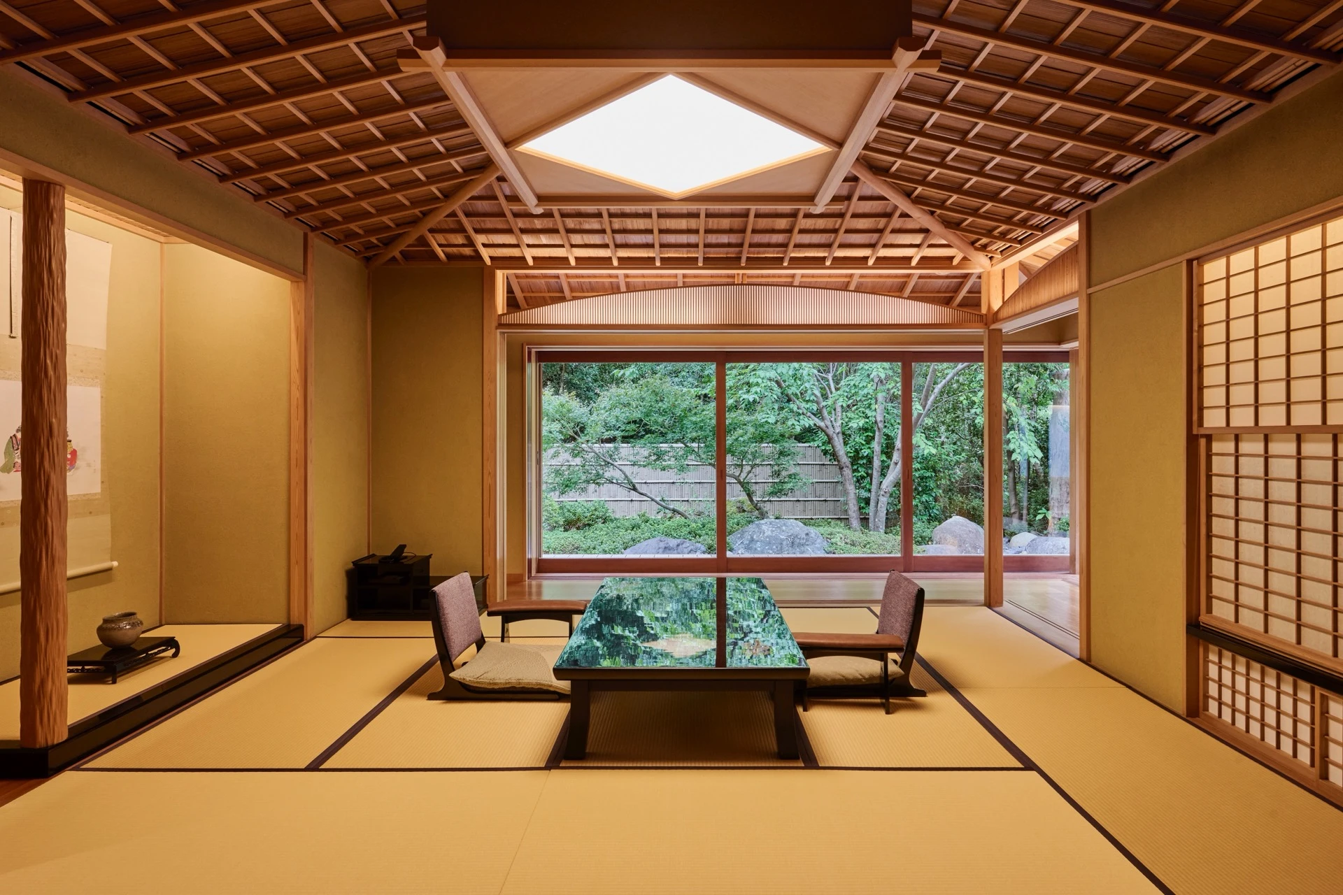 1,000坪を超える広大な敷地に、わずか15室。格天井、聚楽塗りの壁、日本建築の美を極めた空間に、海洋深層水を使用した露天風呂を全室に完備。静寂と贅沢に包まれた、特別な時間をお過ごしください。