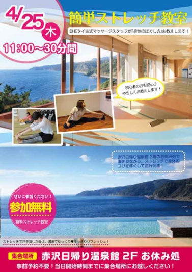 明日の4/25 簡単ストレッチ教室 が11:00より日帰り温泉館で開催されます