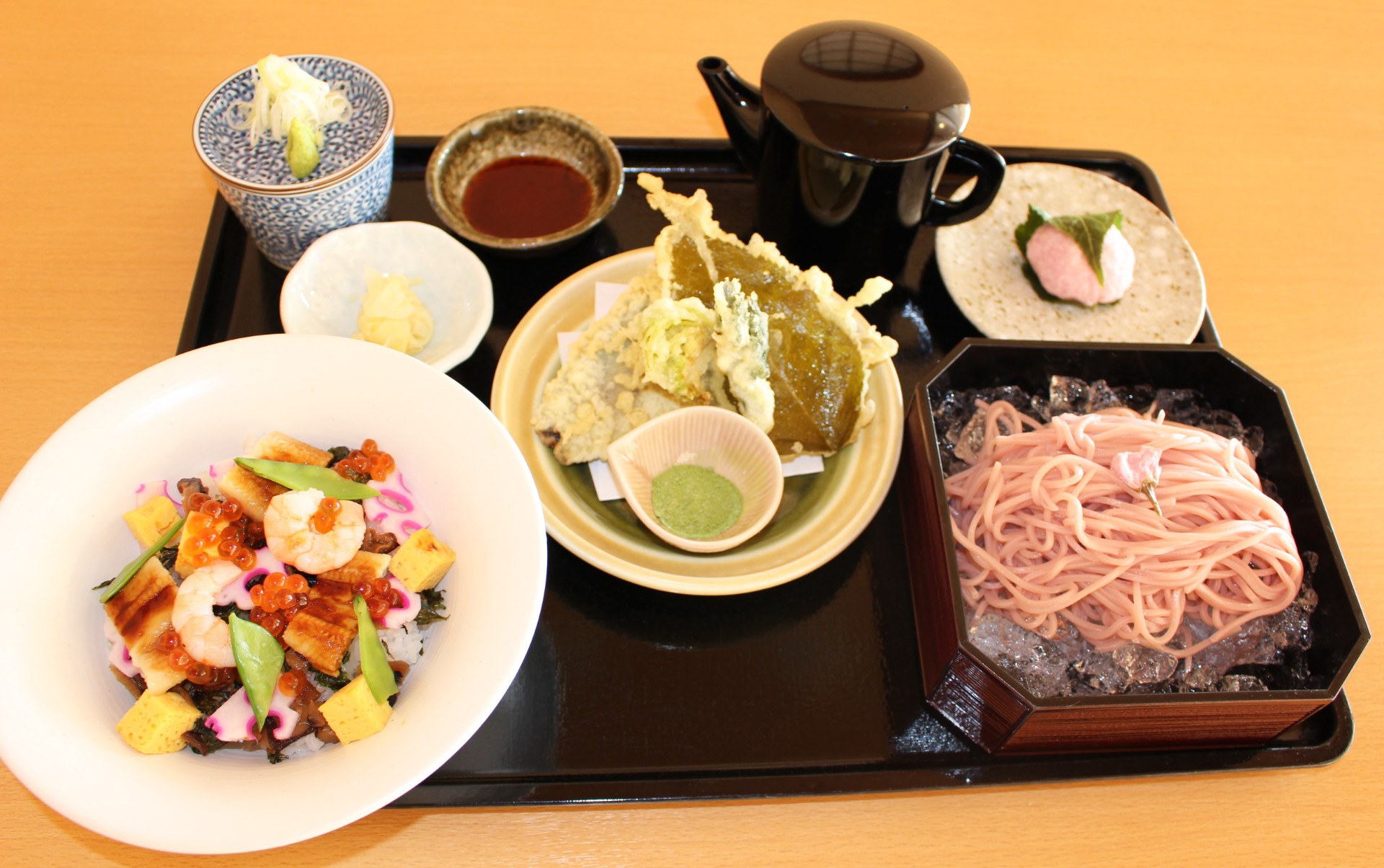 「さくらそばと春のちらし寿司・赤沢鯵と山菜の天ぷら」